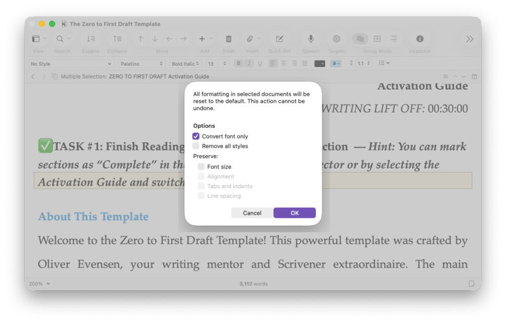 Do not panic if you already have dozens of chapters with messy, mismatched formatting. You do not need to fix them manually. Scrivener provides a powerful tool to instantly update your old work to match your new defaults.